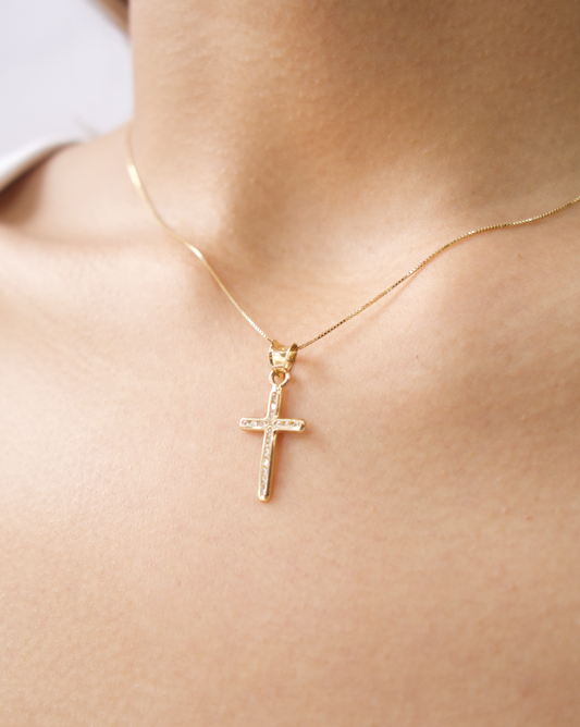 DIJE DE CRUZ DELGADA ORO 14K CON CIRCONIAS
