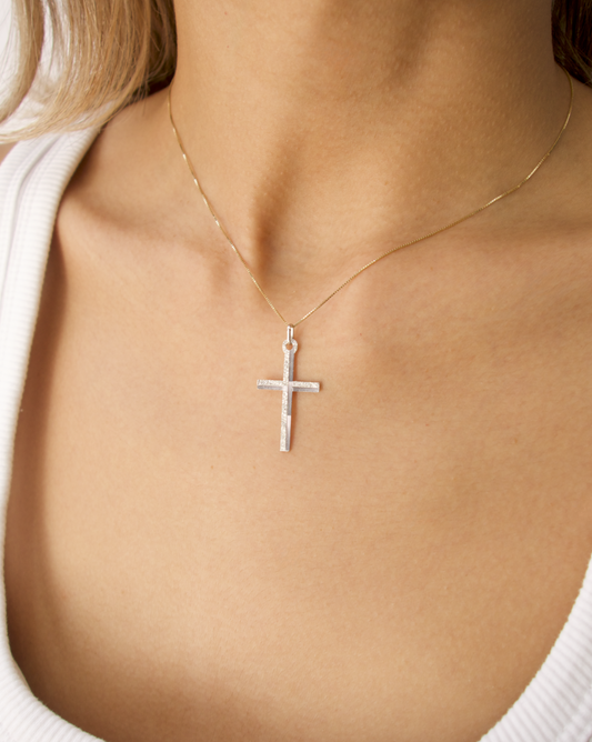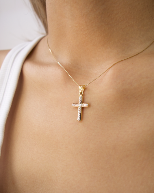 DIJE DE CRUZ FACETADA ORO BLANCO y ORO AMARILLO 14K