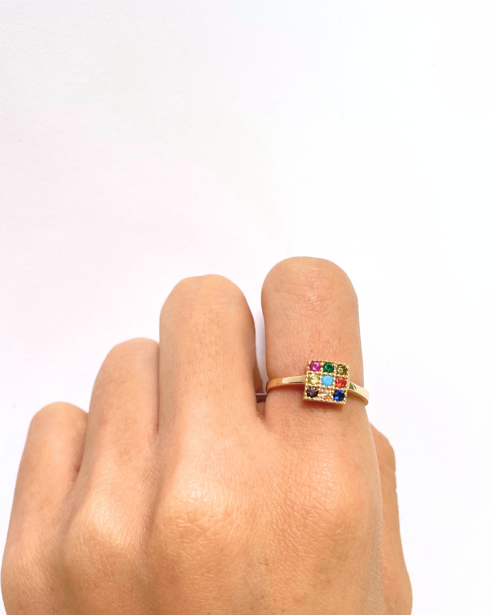 Anillo delgado de oro de 14k con un cuadro con circonitas de colores.
