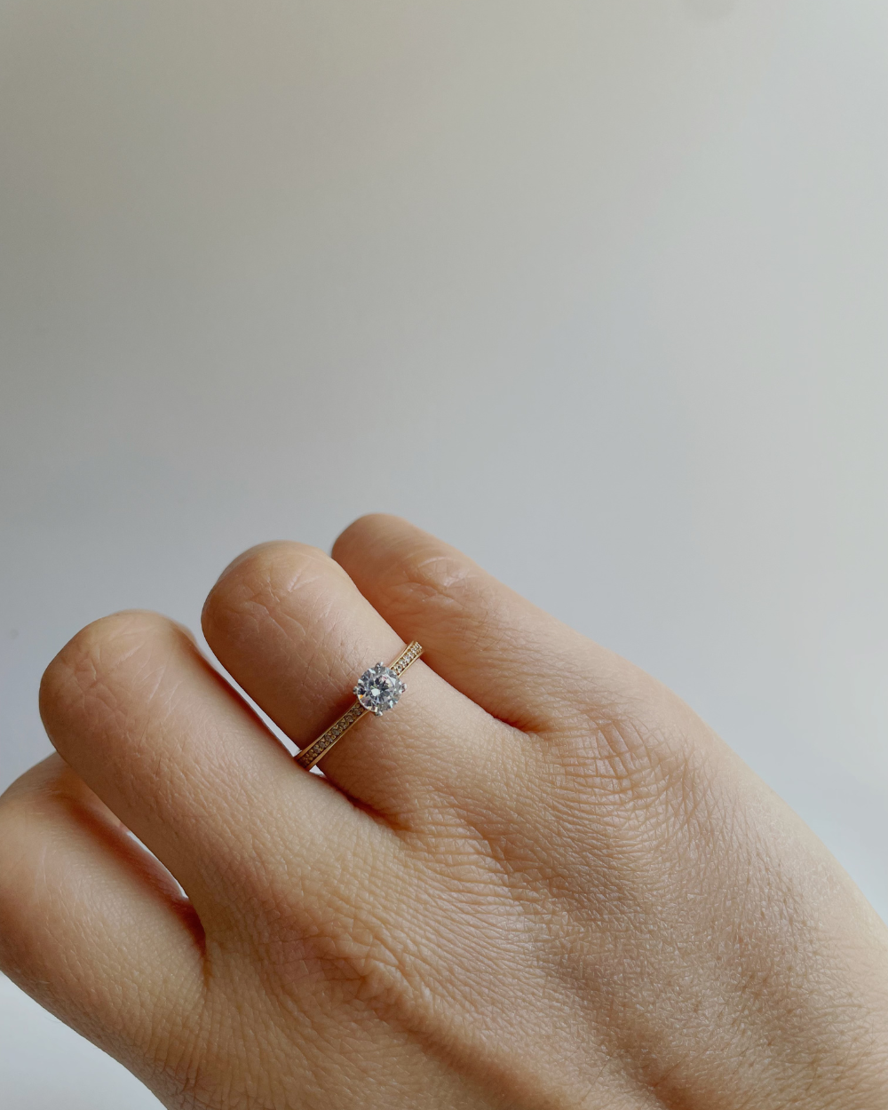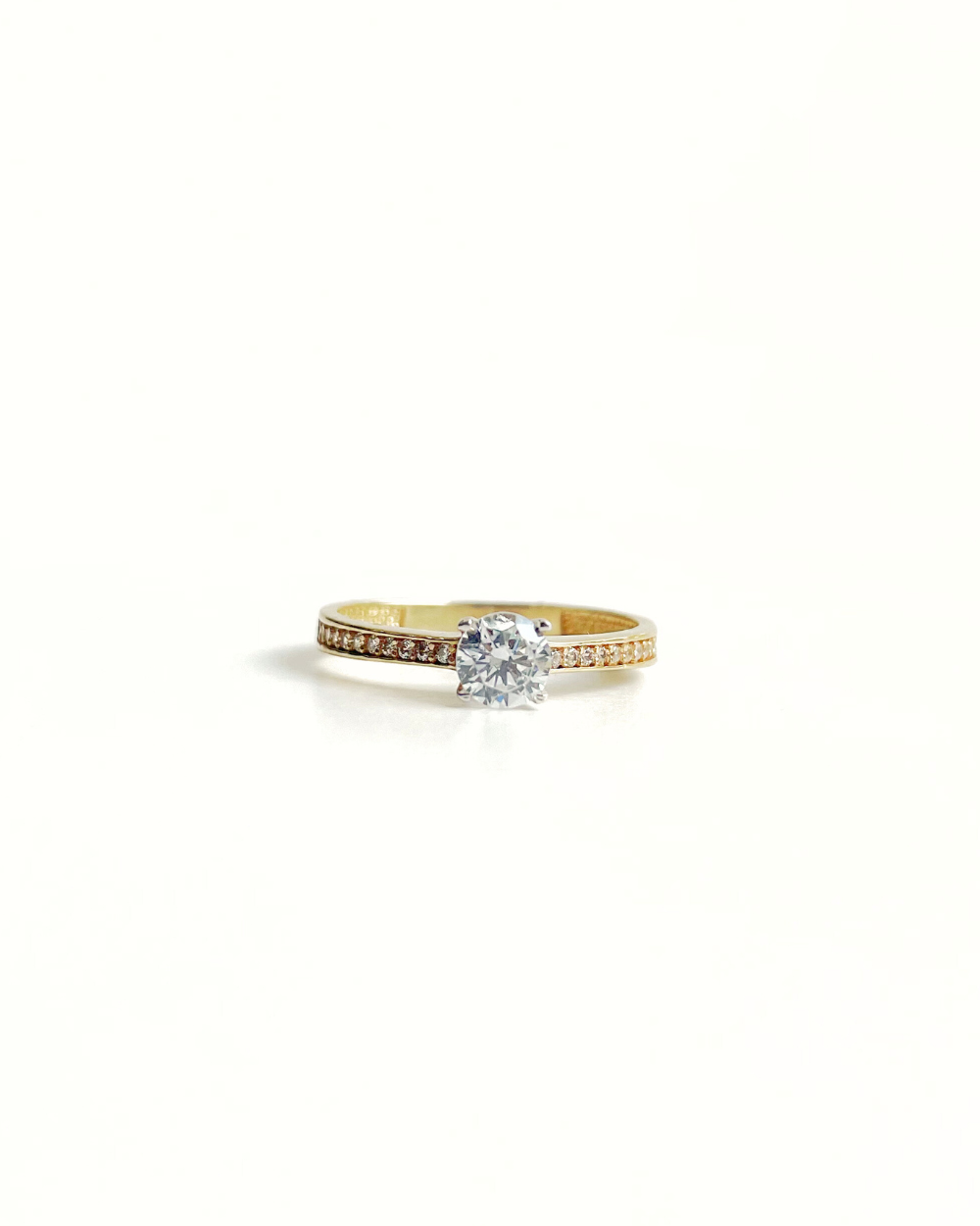 Anillo de Oro 14 Kilates con circonia central y con circonias pequeñas a la mitad del cinturón del anillo.