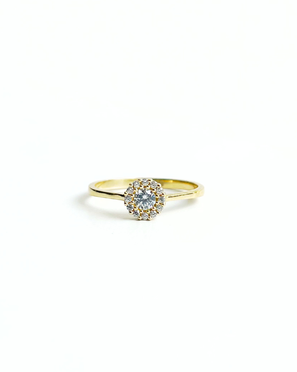 Anillo de Oro 14k delgado con circonia chica en medio y alrededor mini circonias