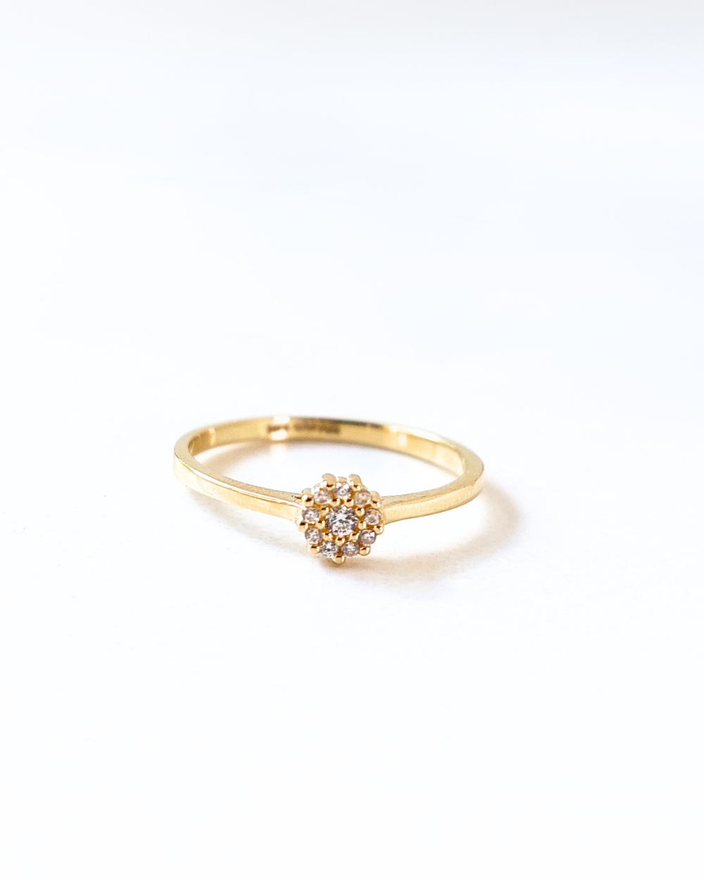 Anillo de Oro 14k delgado con mini circonias en medio del anillo formando como una flor con las circonias