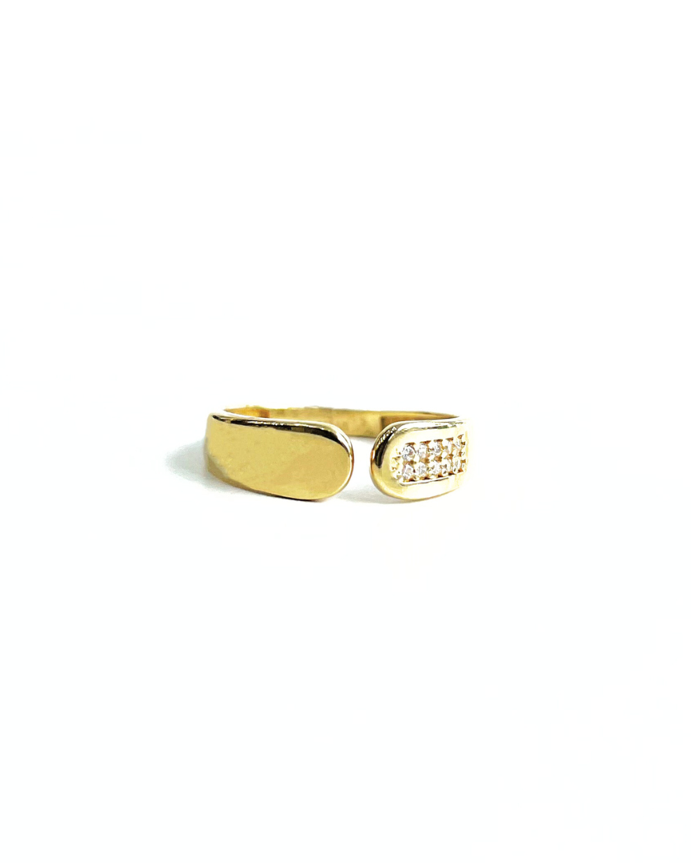 Anillo de Oro 14k kilates, diseño tipo mitad y mitad, ya que de un lado es liso y del otro lado tiene un pequeño rectángulo con circonias blancas incrustadas.