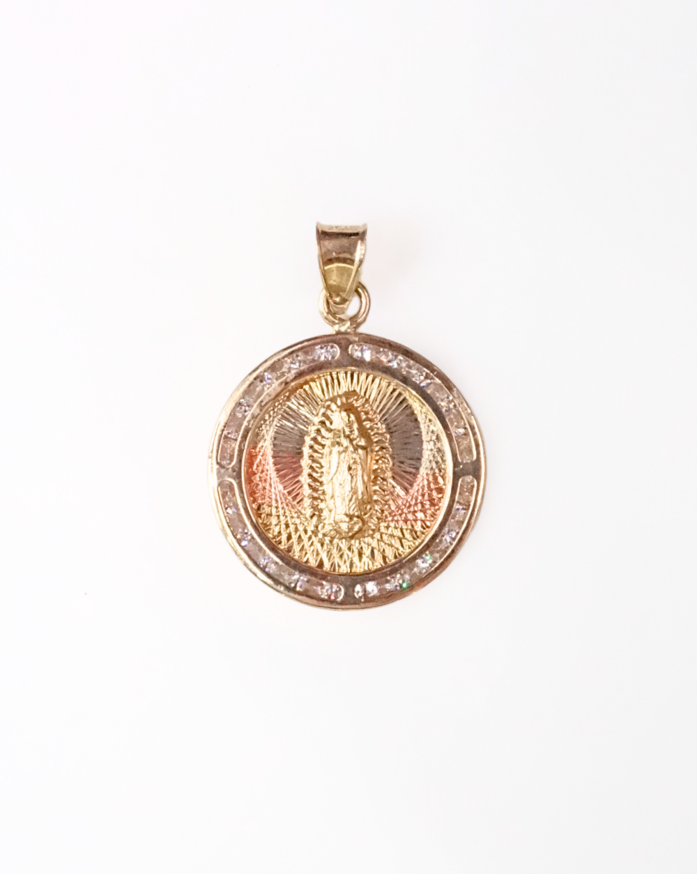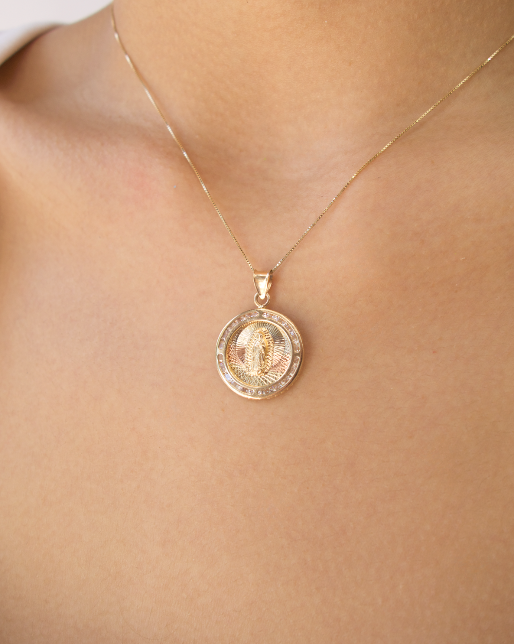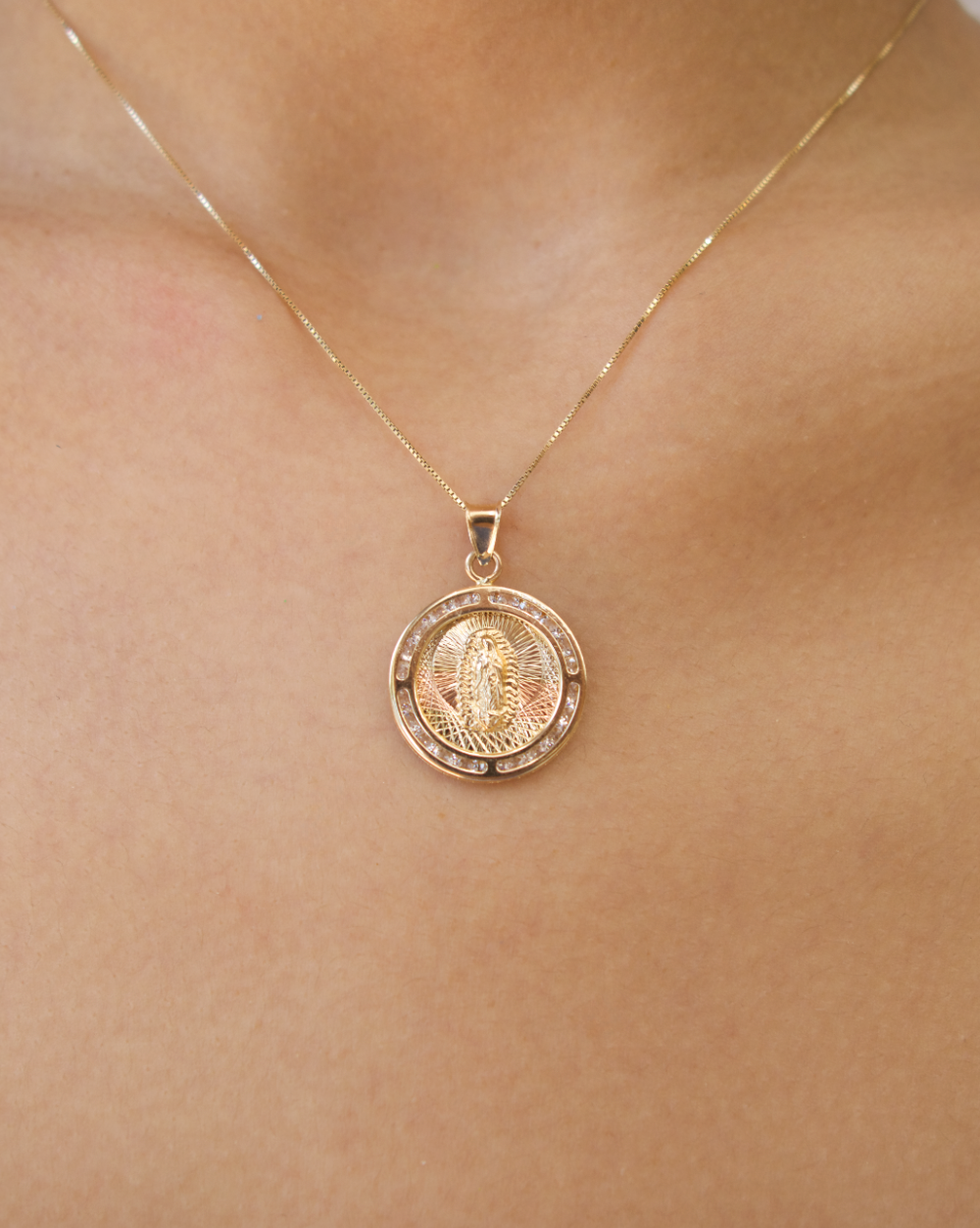 Nuestra Medalla grande circular de Virgen de Guadalupe está elaborada en oro italiano 14k. Este símbolo de fe y devoción no solo realza cualquier atuendo con su elegante diseño. La calidad del oro italiano se refleja en cada detalle de esta pieza única.