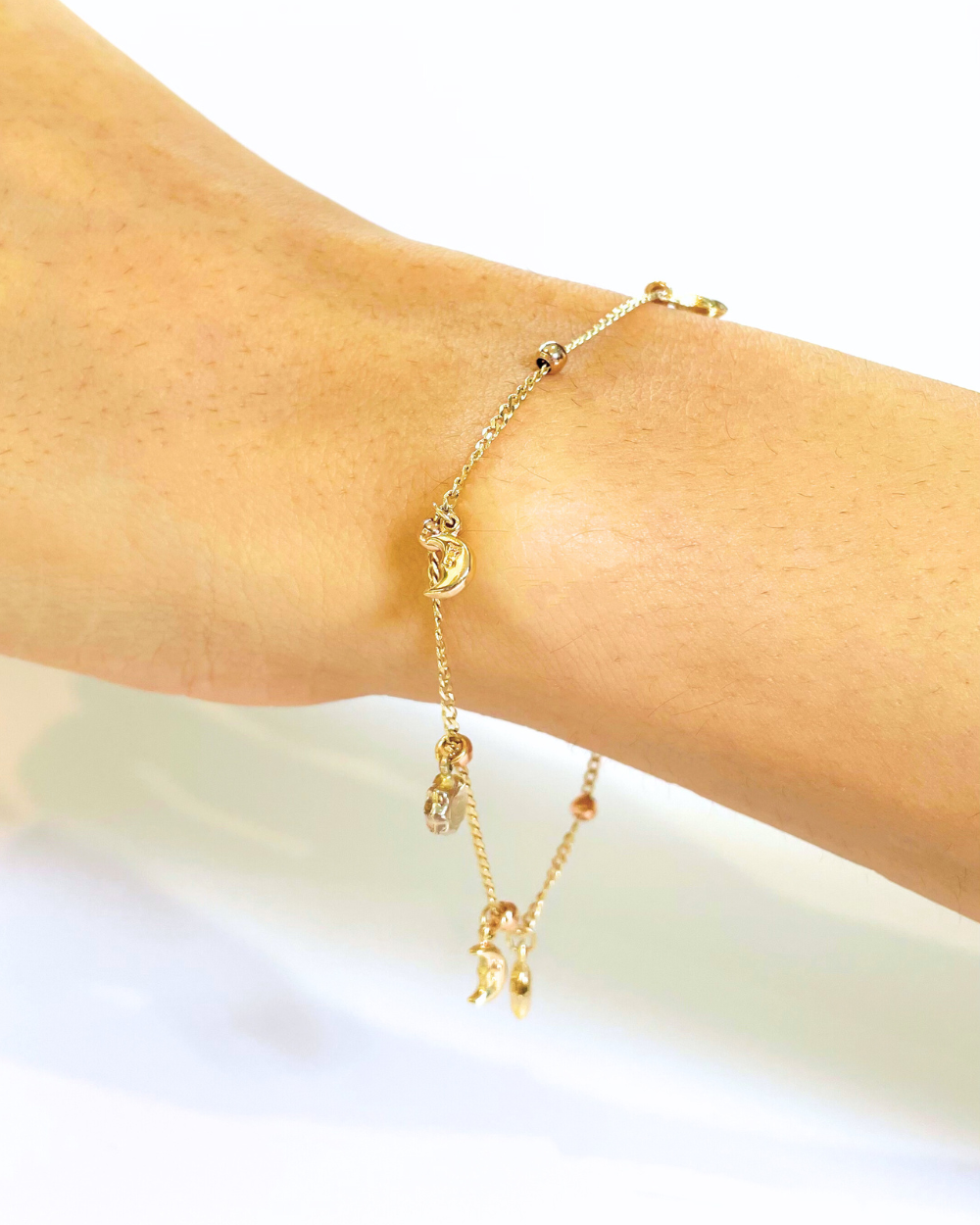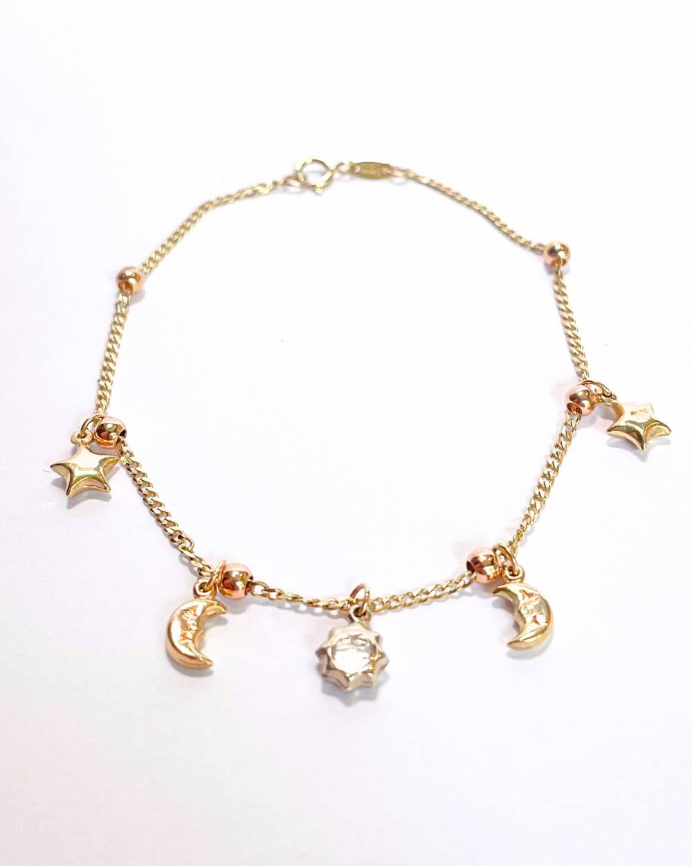 Pulsera de Oro 14k con cuentas de oro y charms de lunas, estrellas y sol Largo: 17cm
